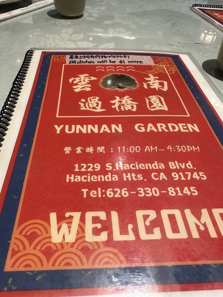 Yunnan Garden is a Chinese restaurant located in Hacienda Heights, CA, offering a variety of delicious dishes with options for vegans and vegetarians. With a range of noodle and rice noodle options, like the flavorful Beef Noodle in Clear Broth and the spicy Guiyang Spicy Chicken Noodle Soup, there is something for everyone to enjoy. The soup selection includes comforting choices such as Beef with Tofu Soup and Seafood with Tofu Soup. Don't miss out on the appetizers like Egg Rolls or the PanFried Green Onion Pancake to start your meal off right. With amenities like waiter service, Wi-Fi, and TV, Yunnan Garden provides a casual dining experience suitable for groups, families, and even furry companions. Experience the authentic flavors of Yunnan cuisine at Yunnan Garden and leave satisfied and eager to return.